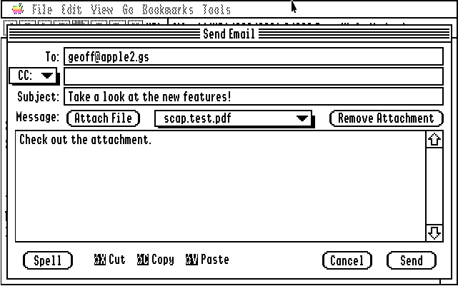 | MiniFinder: View a disk directory. Control-DoubleClick to view File Information. File operation options are presented. Bookmark an application for easy launching! | View of the File Menu from a directory listing shows all items selectable | Sending email could not be any easier. Pop-up menu in the header chooses between BCC: and CC: |